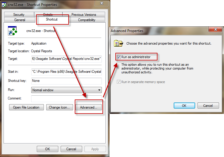 I've been able to solve this problem by creating a shortcut to "C:\Program Files (x86)\Seagate Software\Crystal Reports\crw32.exe" (remove the "(x86)" if you're not 64bit) and then setting this shortcut to "Run as Administrator", as shown in attached screenshot.