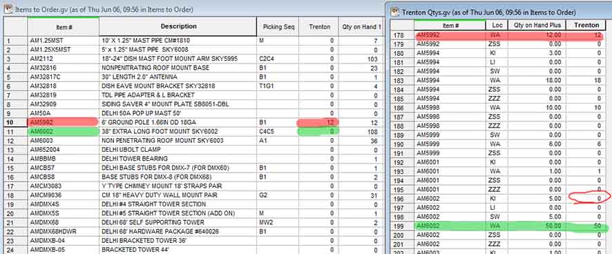 Here is the issue I am having. In Trenton Qtys.gv I have a column that only has the WA qtys. I can't seem to add a second filter because its my second Gridview in the work space. When I pull the Trenton column from Trenton Qtys.gv to Items to Order.gv I believe it pulls the first qty from the Trenton column in the Trenton Qty's.gv file. In the screen shot below you can see AM5992 (in red) only has 2 locations WA and ZSS it pulls the 12 over from WA. AM6002 (in green) has 6 locations KI, LI, SW, WA, ZSS, ZZZ. I believe it is pulling the 0 from KI (circled in red) because its the first amount for that item. How can I get this to show me to correct Qtys?