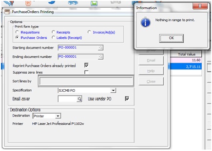 However now the client is attempting to print purchase orders a message keeps coming up stating there is nothing in the range to be printed. They ensured that the option to Reprint Purchase Orders already printed is selected and still same message comes up.