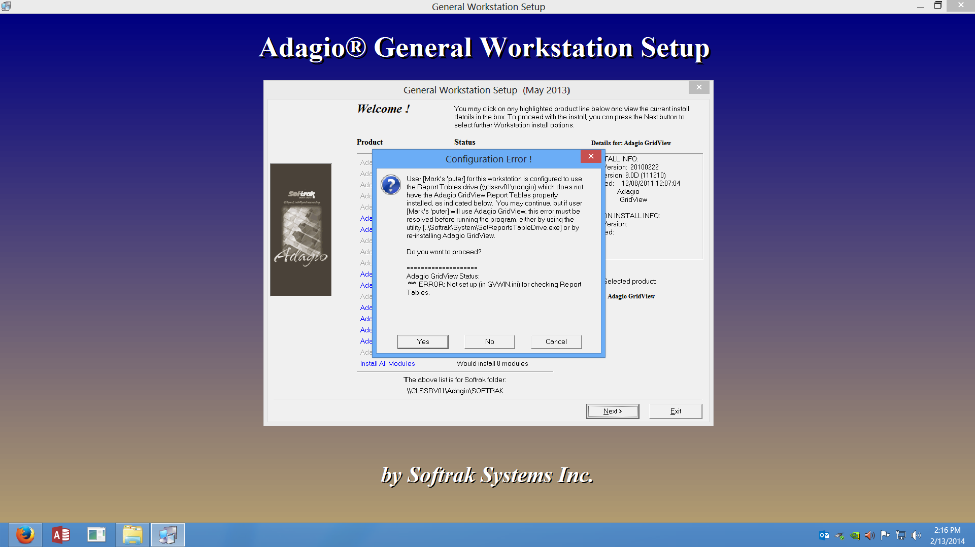 I am seeking some assistance and hopefully this is a straight forward question. My problem is with installing Adagio GridView on a computer running Windows 8 Professional. Below is the error message I am getting when I attempt to install the GridView module.
