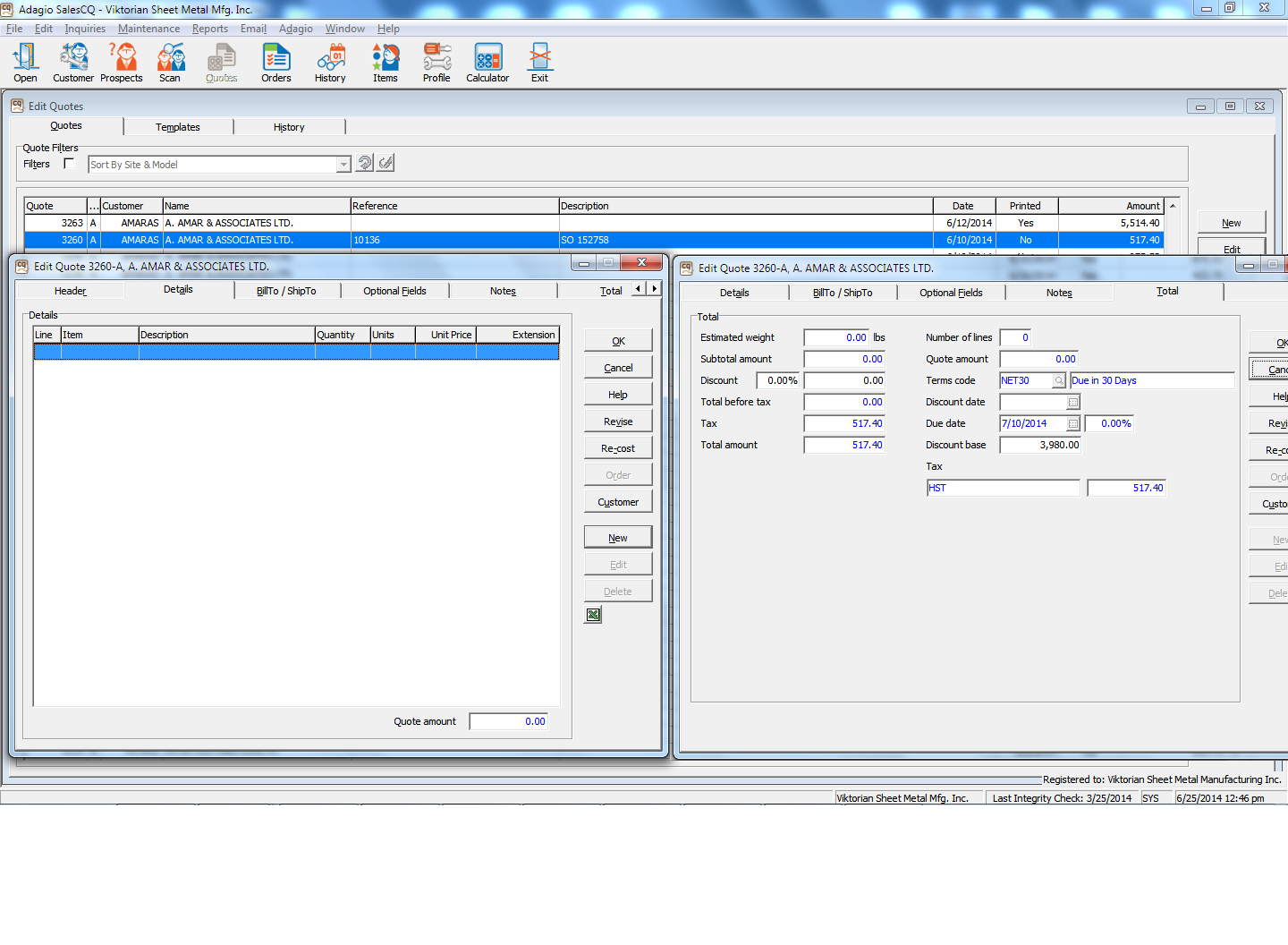 The details on the quote where gone. The tax was still showing, and the discount base shows the amount that was the subtotal amount. Closing and re-opening the quote has no effect. I've attached a screen shot. I edited it so the two tabs can be seen at the same time. This has happened before but I could never re-create it. One thing that did change was the quote went from showing printed to non-printed, but no change in revision level. I'm going to fix the quote and put it through.