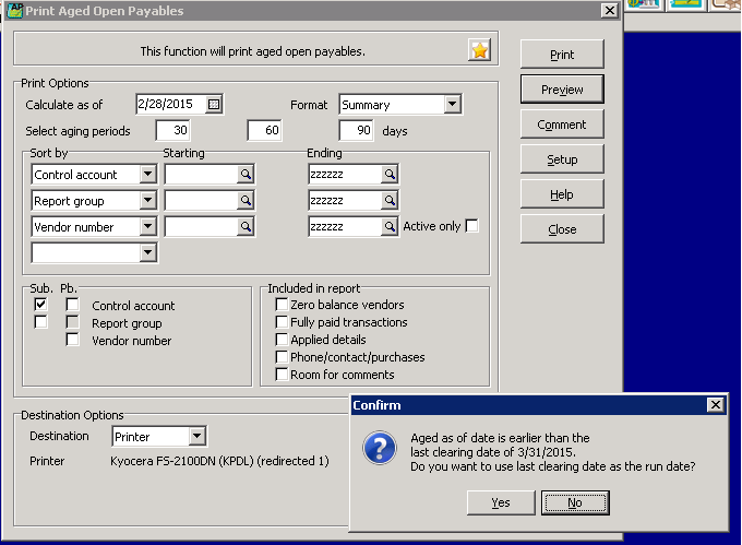 My last clearing date was 03/31/2015. I'm running a report (Aged Open Payables) Calculated as of 02/28/2015 and I get a restriction. Please see screenshot.