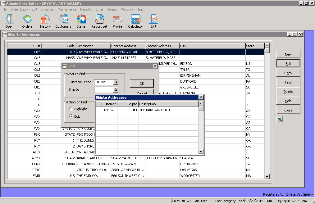 In Adagio OE8.1F (150227) Ship To Addresses smart finder, I type in the Customer Code and then tab to Ship To and press down arrow key, the list shows an incomplete none related information.