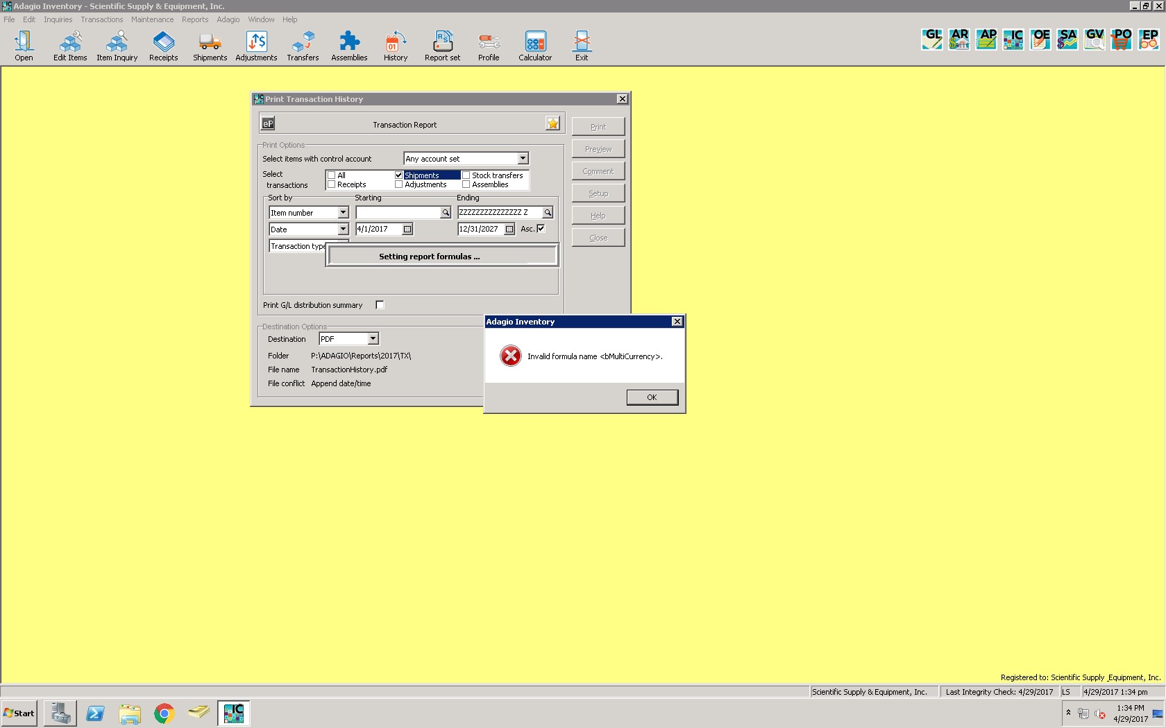 I've been getting this error when I try to print reports in inventory. Particularly the transaction history report. When I get the error it hangs up Agagio and I am forced to close inventory and reopen it.