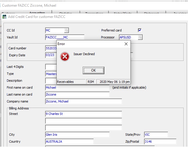We tried to make a charge in Adagio Payments and had a problem. Our customer in Australia sent us an email saying "Our credit card system in Australia now requires that a temporary passcode be sent to a mobile phone that has to be written in to the payment box when making overseas transaction payments. I will send you a bank cheque by mail with the invoice attached."