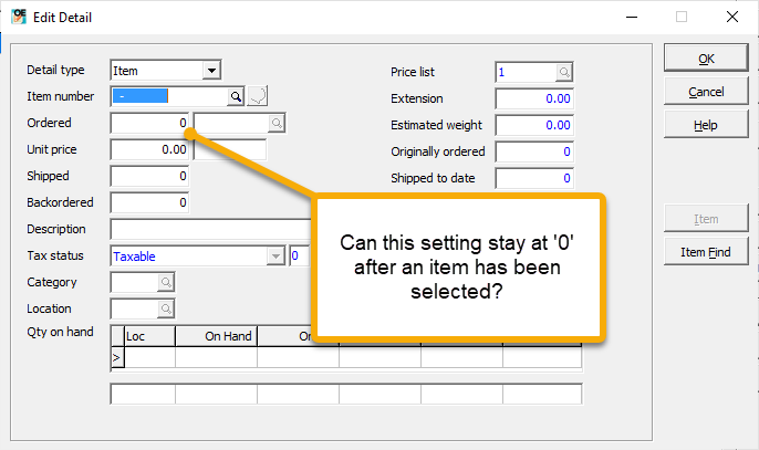 As per the screen shot attached is there a way to keep the default quantity ordered at zero after an item is selected? Once an item is selected it changes to a '1'. Just curious.