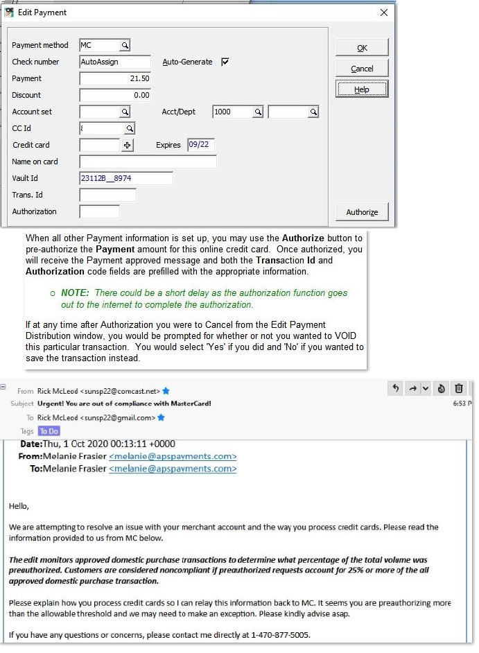We have run into an unexpected problem with our merchant processing in OE Payments. In the Autopay window there is an Authorize button in the lower right. If an invoice is written and the button is clicked it actually Pre-Authorizes the transaction and is unnecessary in most invoices. If some one routinely clicks this button you will run into problems with APS and M/C.