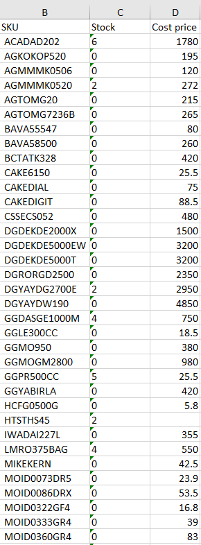 The report would have a heading like this: | Product SKU (in the order I want FIXED) | Stock (quantity on hand) | Cost Price |